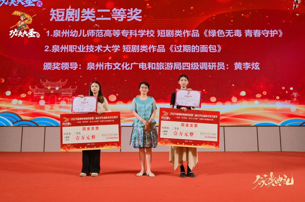 活动现场正式公布了首届“荣誉杯·功夫大圣奖”短剧与短视频大赛结果,共评选出13部短视频类、短剧类优秀作品,并举行颁奖仪式。由我校艺术传媒学院数字媒体艺术专业陈丽纯、叶芳晓、高淑娴、王晓泽、谢文洋、季志营共创作品《过期的面包》荣获短剧类二等奖(指导老师于哲、庞志龙),蓝渠彬、张鹏、朱赫、黄宇煊、杨鈜亮共创作品《奇校诡实录》荣获短剧类优秀奖(指导老师赵小源),同时泉州职业技术大学荣获最佳组织奖。