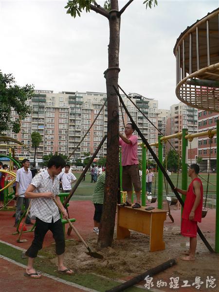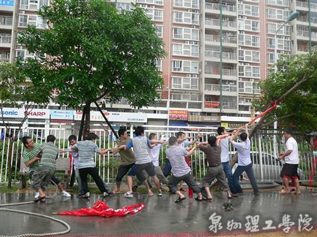 由于本次台风来势凶猛,降雨量大,导致学校部分广告牌被台风刮坏、车棚倒塌、部分树木被连根拔起、校园内严重积水、学校北渠道路堵塞。发现险情后,学校领导召开了自然灾害防御工作应急会议,成立抗灾领导小组,对学校的受灾情况进行全面巡查、评估,立即启动应急措施,组织力量进行灾后抢险和抢修工作。在校领导的带领下全校师生众志成城投入到紧张的抢修工作中