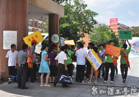 校门口高举系牌迎接新生