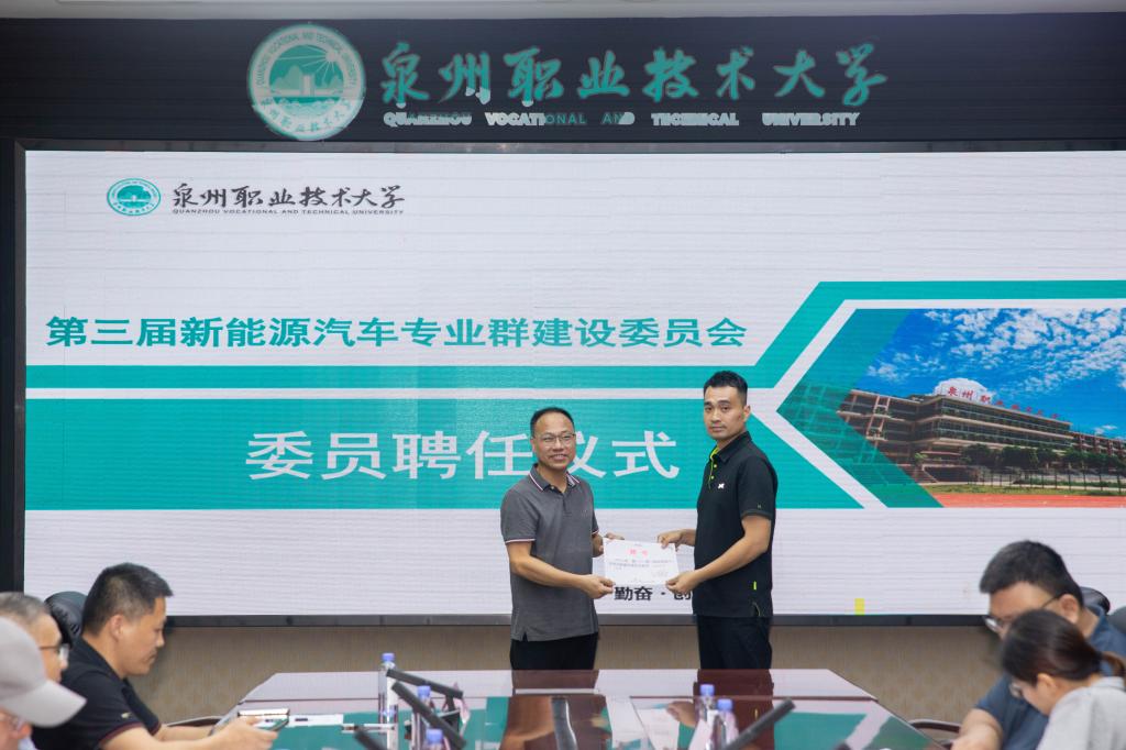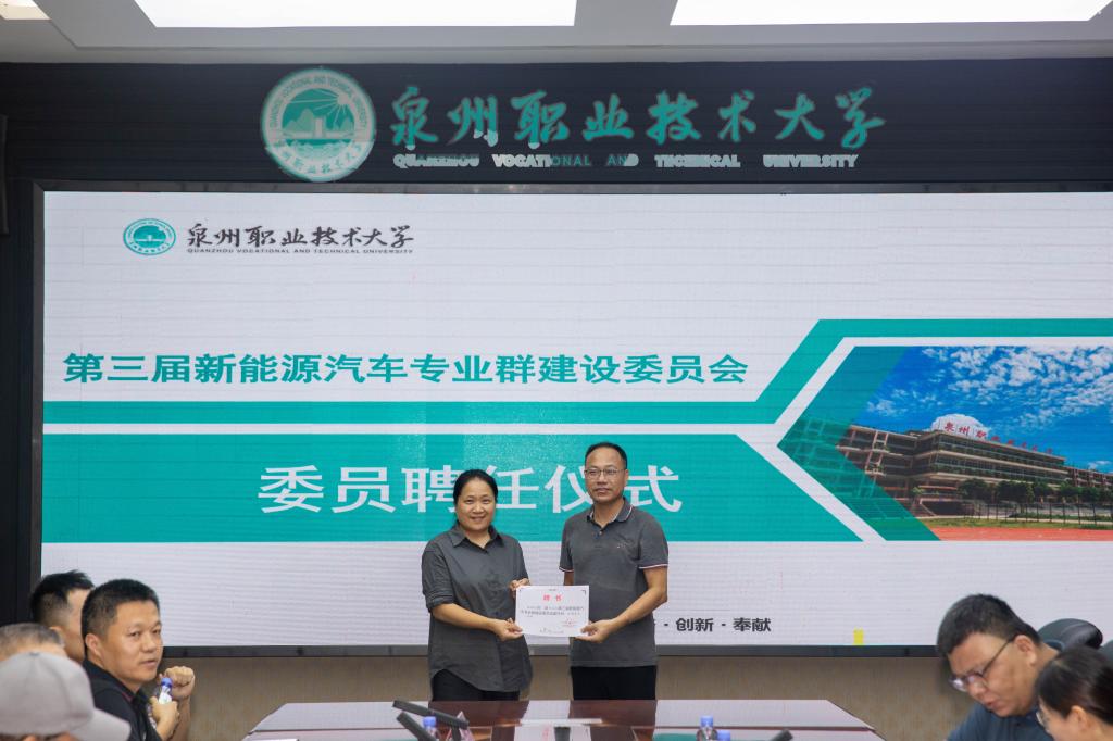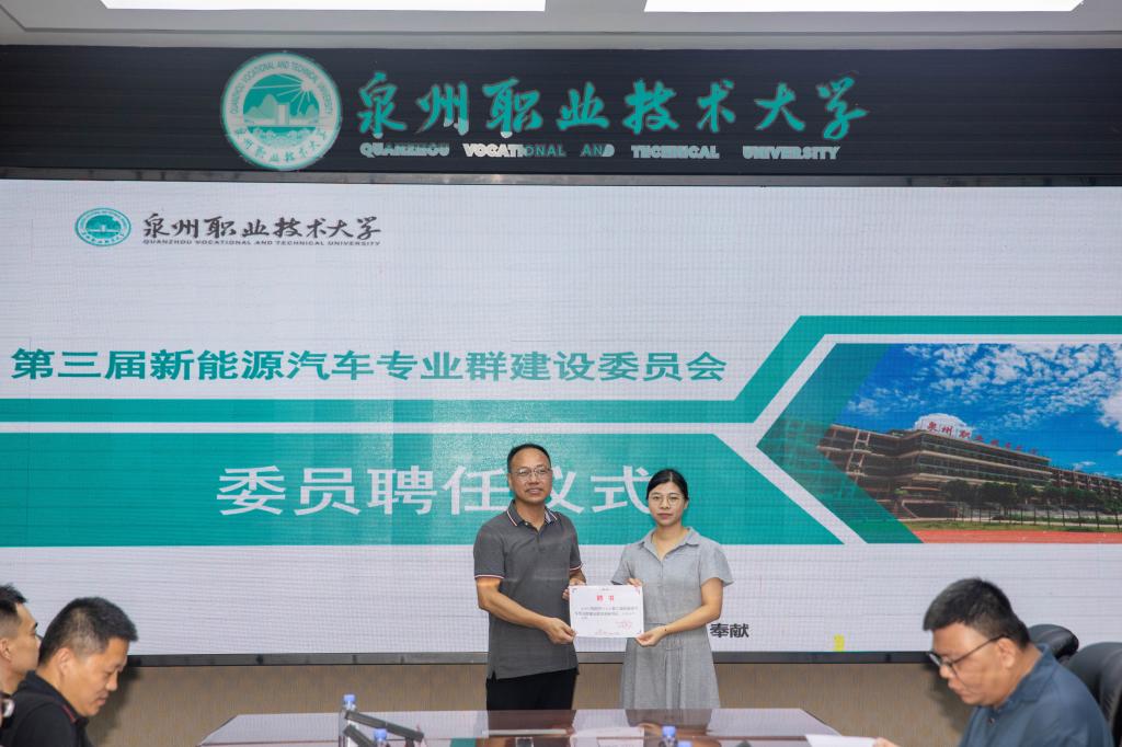 随后进行本次会议的第一项议程,为新聘任的新能源汽车专业群建设委员会主任、副主任以及委员颁发聘任书。