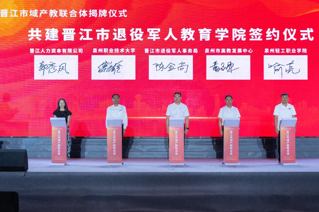 晋江市退役军人事务局局长陈金尚、泉州市高教发展中心主任黄永东、泉州职业技术大学党委书记傅志雄、泉州轻工职业学院副校长喻亮、晋江人力资本有限公司总经理助理郭秀凤签约共建“晋江市退役军人教育学院”。