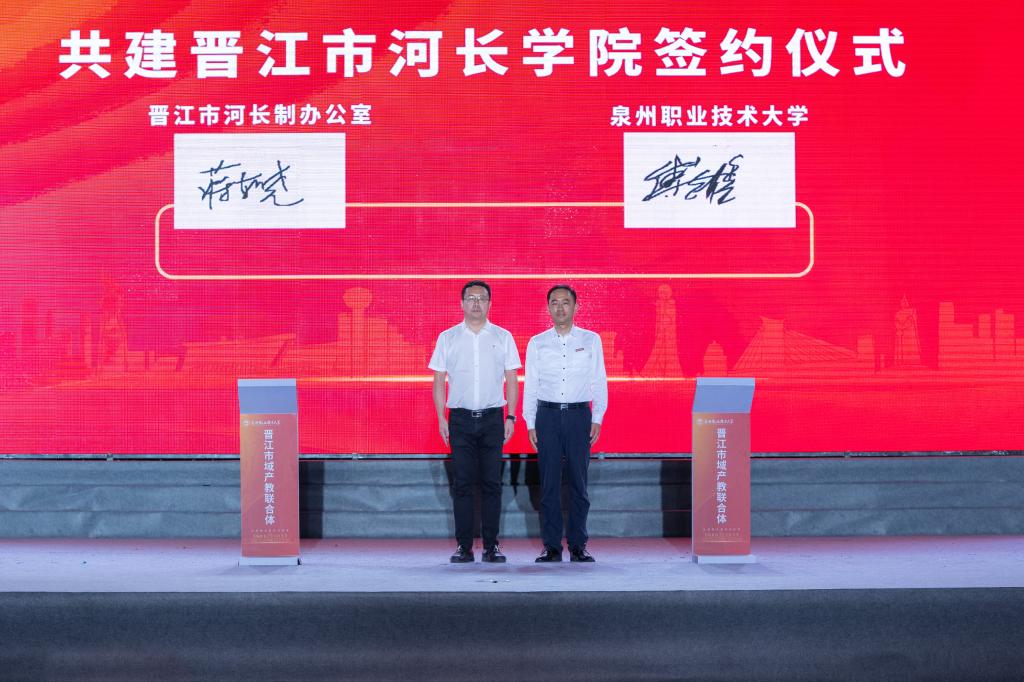 晋江市河长制办公室常务副主任、晋江水利局局长蒋东晓和泉州职业技术大学党委书记傅志雄签约共建“晋江市河长学院”。