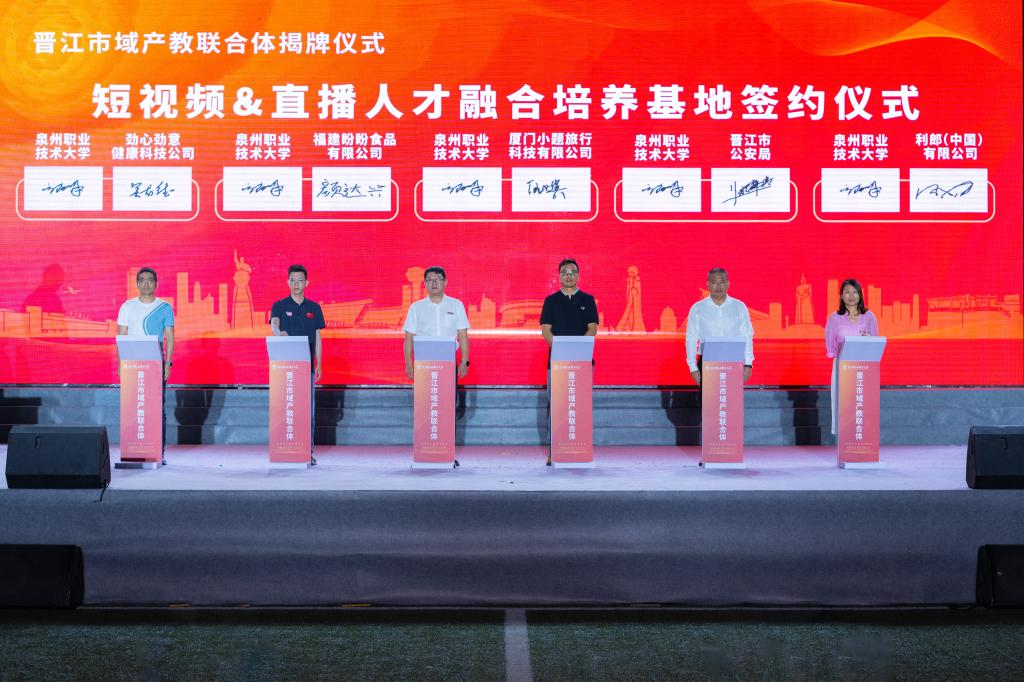 泉州职业技术大学副校长郭霏霏和厦门小题旅行科技有限公司董事长汪小宾、晋江市公安局党委委员姚常青、福建盼盼食品有限公司电商负责人颜达兴、利郎(中国)有限公司主品牌总裁助理陈志梅、劲心劲意健康科技公司总经理助理吴龙德,分别签署共建合作协议。