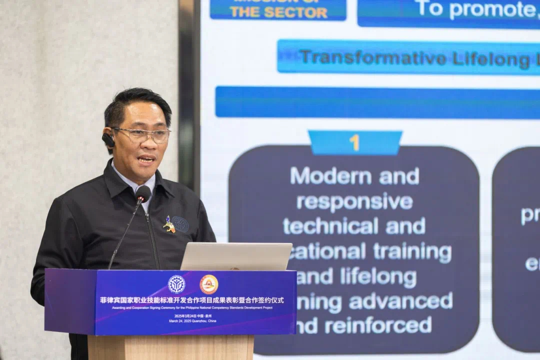 埃尔·西德·卡斯蒂略致辞,他表示,中菲职业教育合作将聚焦中国先进经验,借鉴中国校企合作、双元制培训体系及数字化技能培训等模式,推动菲律宾职业教育体系升级,助力现代化技能发展体系的构建。通过加强合作促进职业资格全球互认,提升菲律宾劳动者跨境就业竞争力。他指出,TESDA计划通过师资交流与国际合作重塑职业教育社会形象,扩大招生规模,培养具有全球竞争力的菲律宾人才,推动国家经济转型与可持续发展。此次活动标志着中菲职业教育合作迈入新阶段,为菲律宾劳动者参与全球竞争提供战略支撑。
