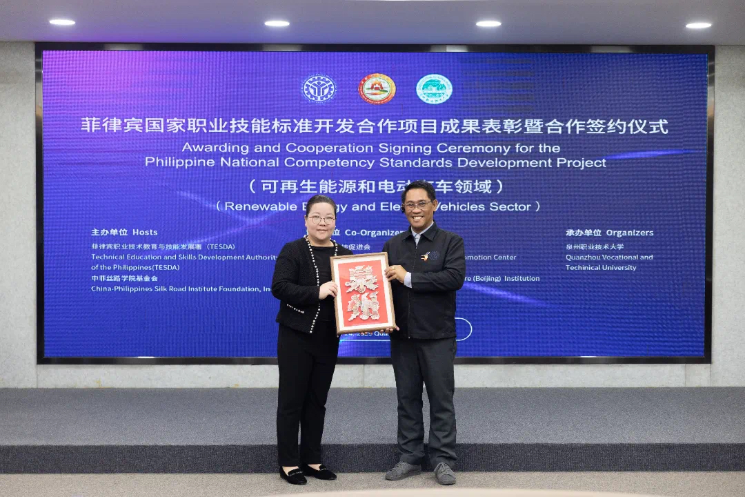 3月24日,菲律宾国家职业技能标准开发合作项目“可再生能源和电动汽车领域”成果表彰暨合作签约仪式,在泉州职业技术大学举行。活动由菲律宾职业技术教育与技能发展署(TESDA)、中菲丝路学院基金会共同主办,泉州职业技术大学承办。