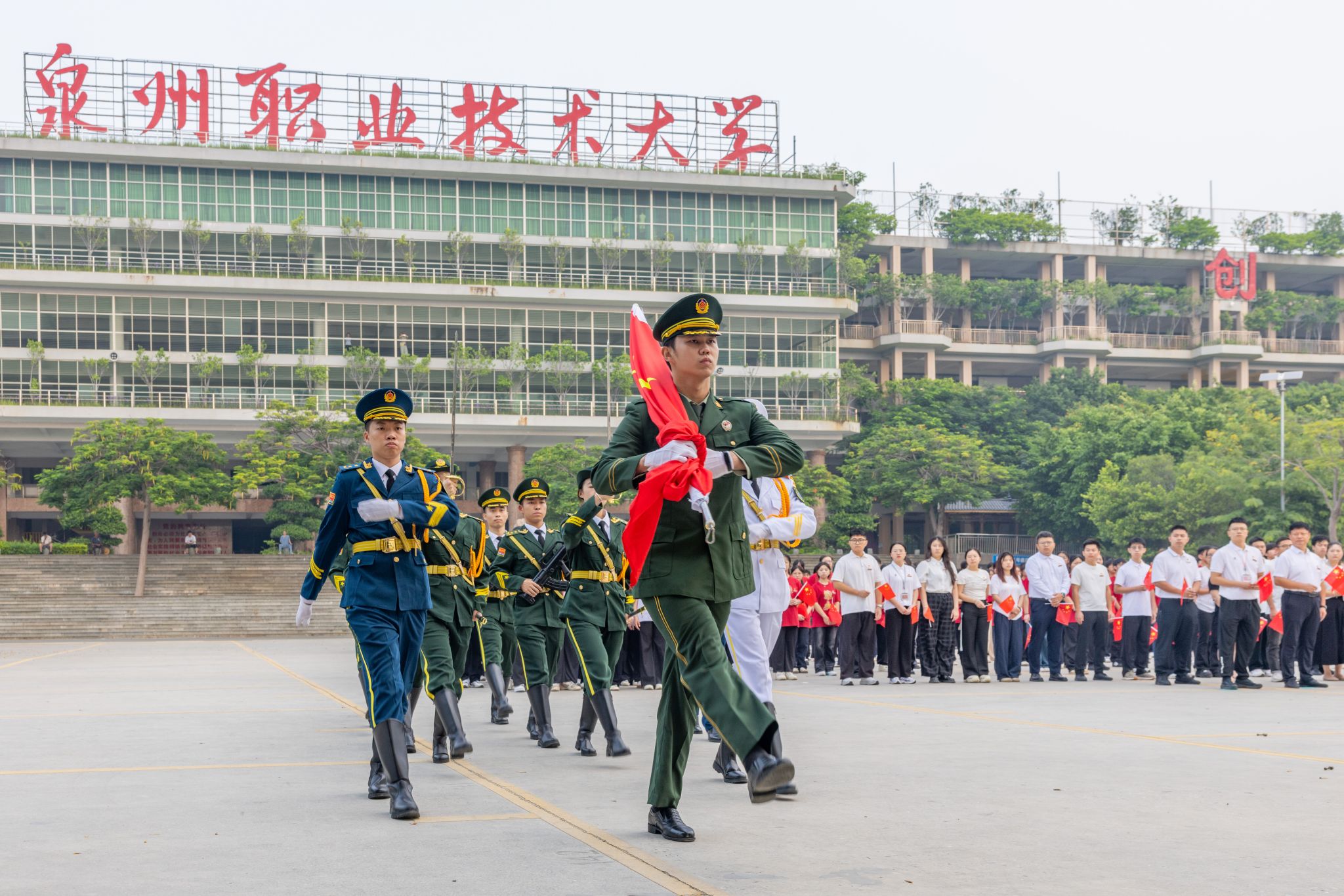 10月1日清晨,泉州职业技术大学师生代表齐聚国旗下,举行庆祝中华人民共和国成立76周年升旗仪式。校党委书记傅志雄、校党委副书记/副校长蔡金佩等校领导,各学院、书院党组织书记,各部门负责人,全体辅导员与学生代表共同见证五星红旗冉冉升起,以青春之名向祖国深情告白。