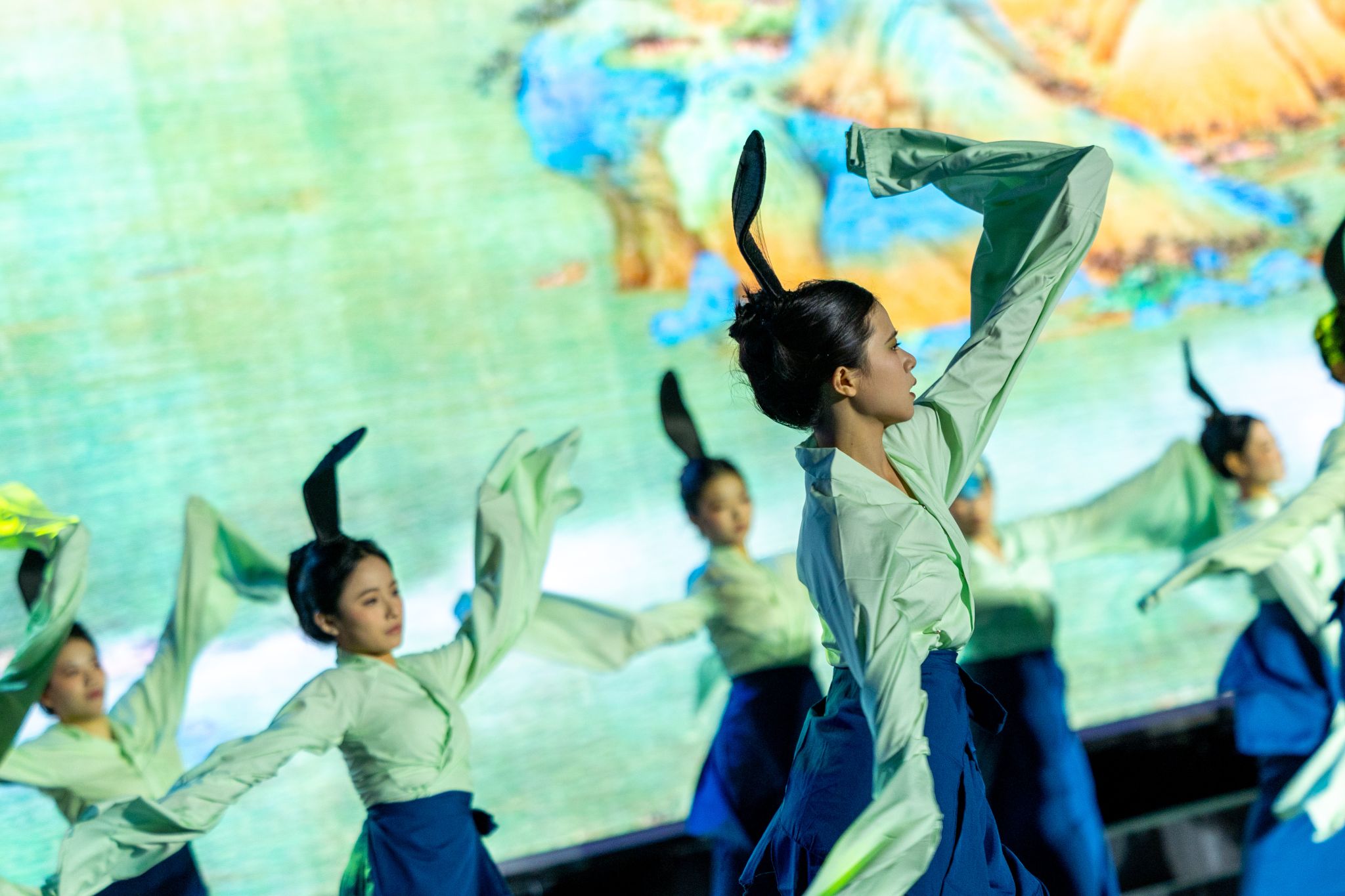 以舞作画,连接千年。教育学院的同学们化身《千里江山图》中的青绿山水,用绝美的舞姿带领我们沉浸式欣赏国宝名画的意境。一静一动之间,工匠精神与传统美学尽数展现,演绎出一场至善至美的视觉盛宴。