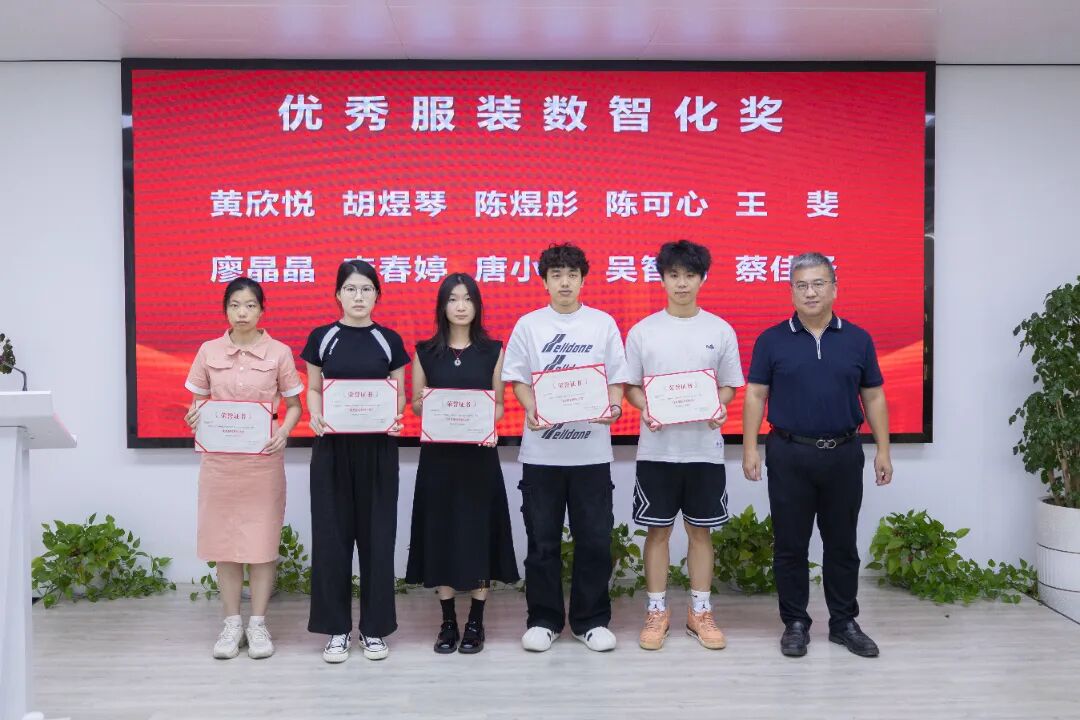 晋江号手服饰有限公司副总经理林荣俊为黄欣悦、胡煜琴、陈煜彤、陈可心、王斐、廖晶晶、李春婷、唐小惠、吴智明、蔡佳圣十位同学颁发“优秀服装数智化奖”,这一奖项是对同学们在服装数智化设计领域出色表现的肯定,彰显了他们的专业能力与创新素养。
