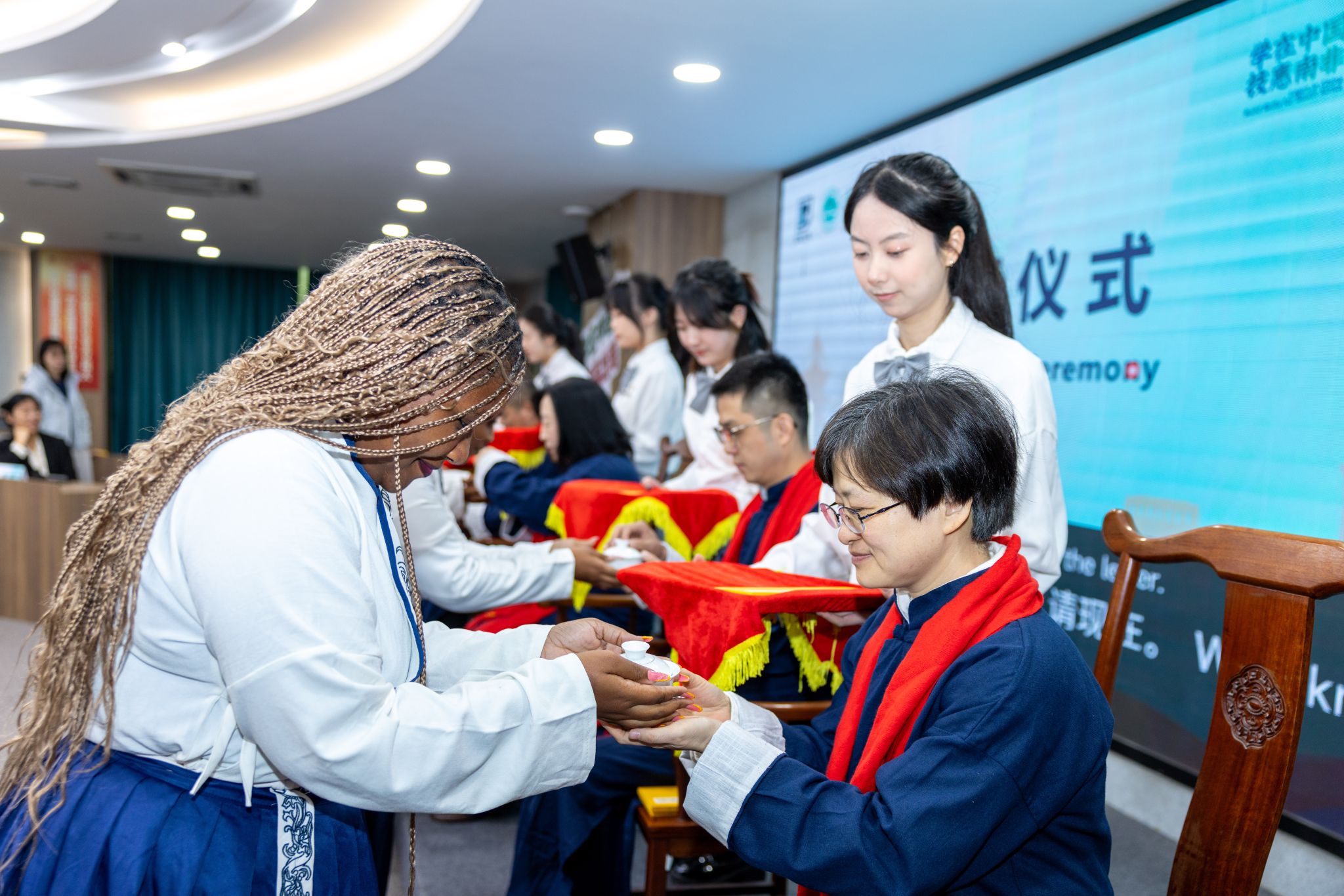 29位南非青年学员身穿汉服,分成6组一一站在老师面前,鞠躬、递帖、敬茶、回帖……在这个充满东方教育智慧与中南情谊的仪式中,学员们与博士、教授、企业家等导师一一结对。师徒结伴,心连中南,这不仅是技能传承的起点,更将不断延续中南友谊。