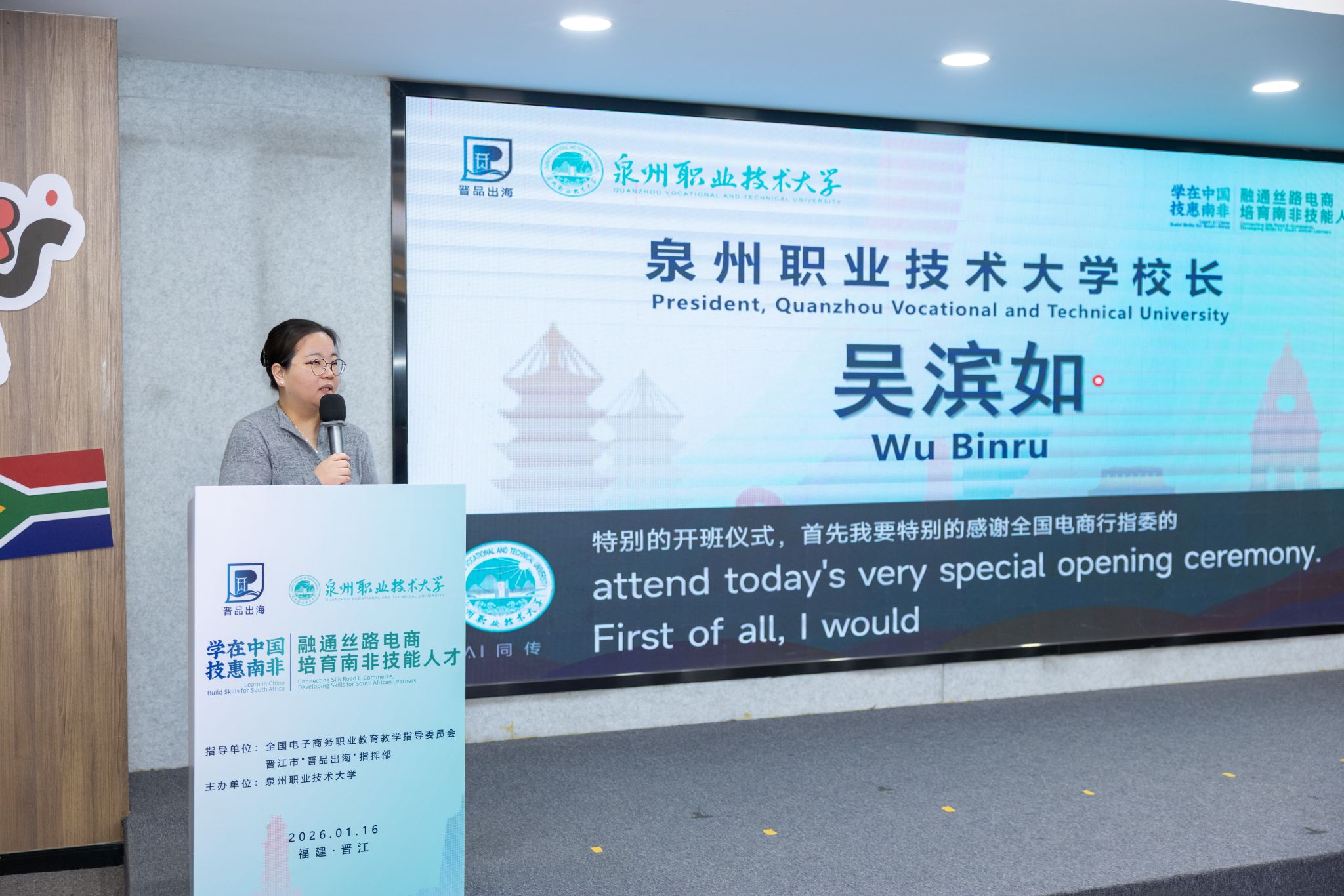 她介绍,学校接到“学在中国”计划南非跨境电商技能专训班项目时,迅速成立十几个部门参与的工作专班,与各级政府、晋品出海指挥部、行业协会、头部企业紧密沟通,为学员的到来做了充分准备。培训将构建理论学习、实训演练、项目实战、文化体验“四位一体”的人才培养体系,并邀请平台公司培训师、行业专家、企业负责人参与教学。她对学员们提出三点希望,要珍惜机会学真本领、广交挚友链接资源、牢记安全平安研学。学校计划学员学成归国时将成立南非校友会,让这份中南情谊得以延续。