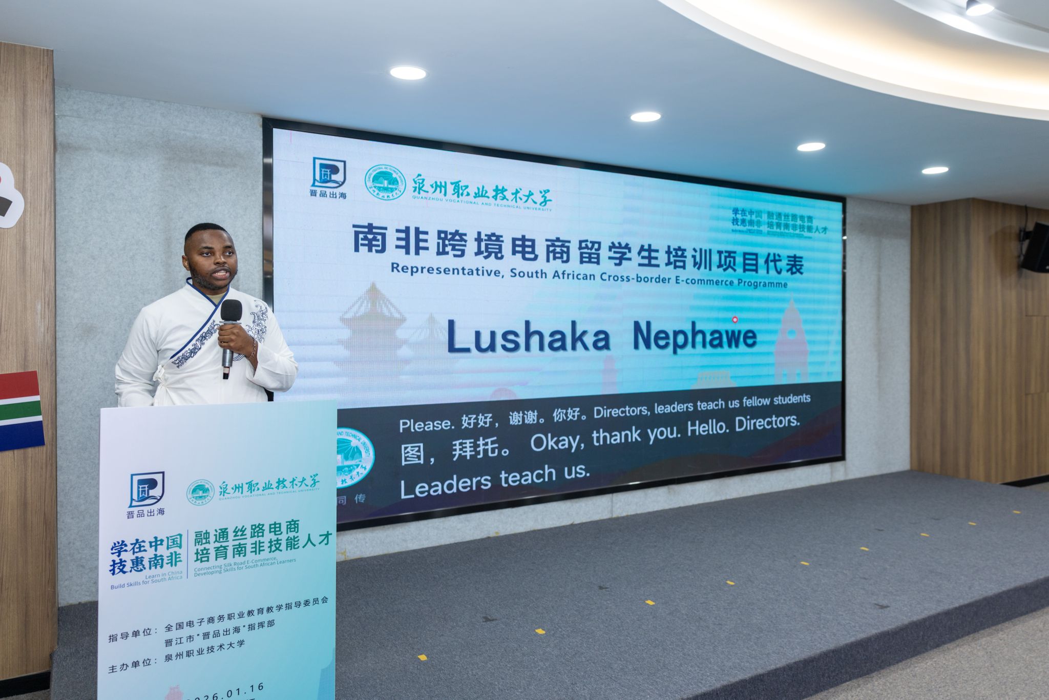 南非跨境电商留学生培训项目代表Lushaka Nephawe表示,泉州职业技术大学超出他们的预期,校园充满活力,设施一流,教师专业又耐心。“我们感谢中国政府以及泉州职业技术大学为我们提供了这样宝贵的学习机会。”他承诺,学员们将珍惜机会,努力学习,成为中南友谊的桥梁。
