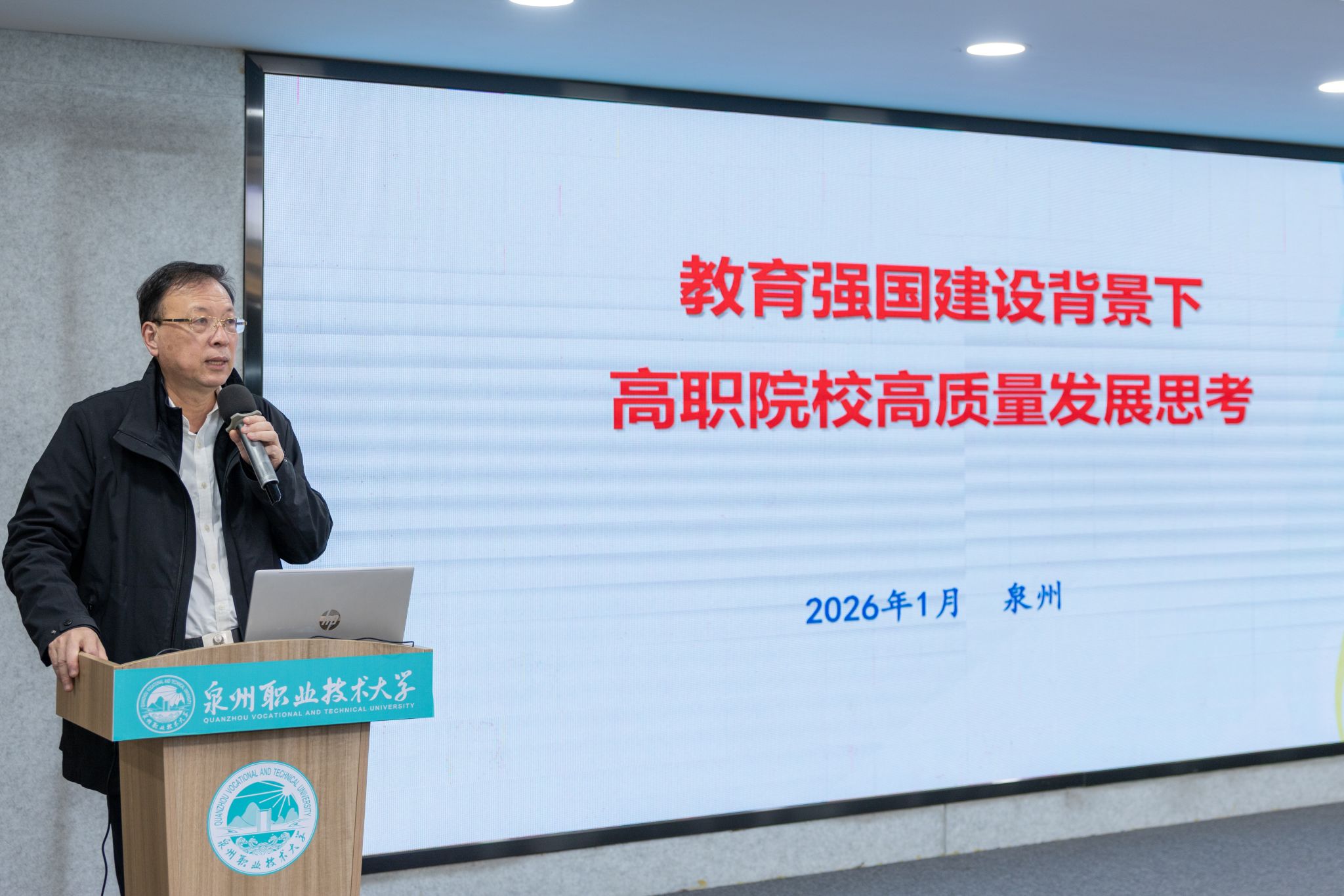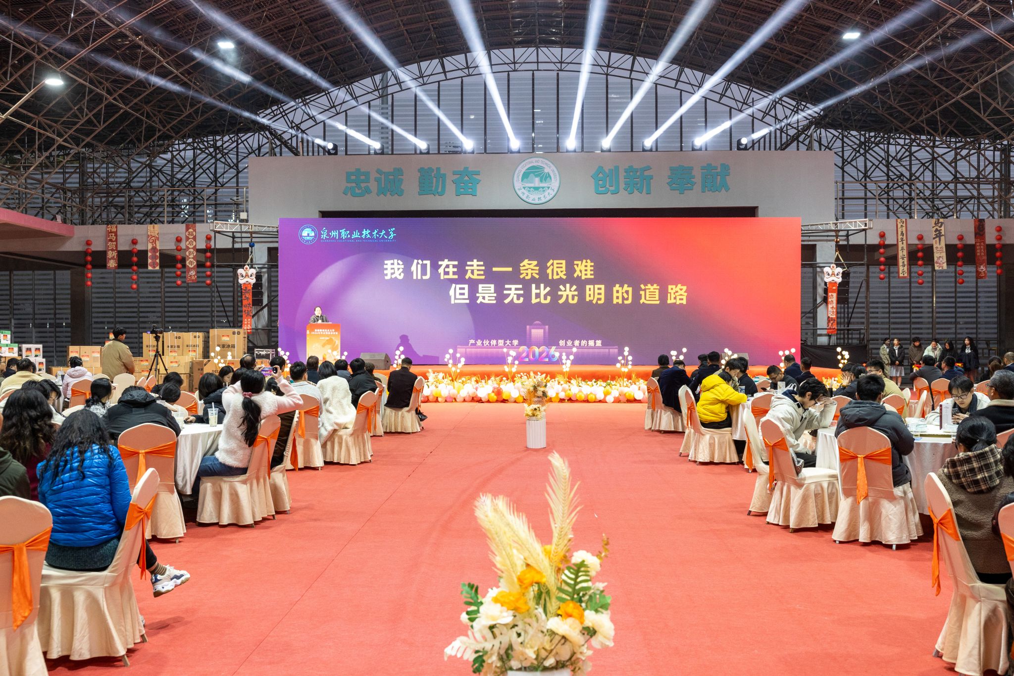 1月20日,泉州职业技术大学隆重举行2026年会。学校创办人、董事长吴金营,泉大教育基金会理事长杨培琛,校长吴滨如,党委书记傅志雄,全体校领导、教职工及产业伙伴代表、南非培训学员参加。年会由傅志雄书记主持。