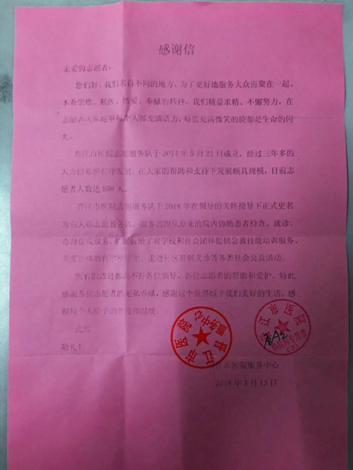 《感谢信》来自晋江市医院对我们志愿者的肯定。并且在表彰大会后和晋江市医院共建单位共商讨了本学期志愿服务展开时间和约定一场日常急救知识讲座。