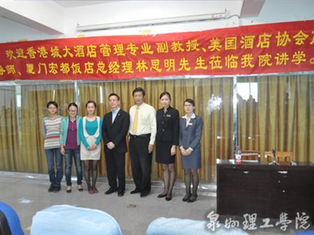 10月 26日下午两点,香港城大酒店管理专业副教授、美国酒店协会高级导师林思明先生到我校进行了长达一个半小时的精彩演讲。商贸系 10级和11级旅游管理及酒店管理的全体同学参与此次活动。
